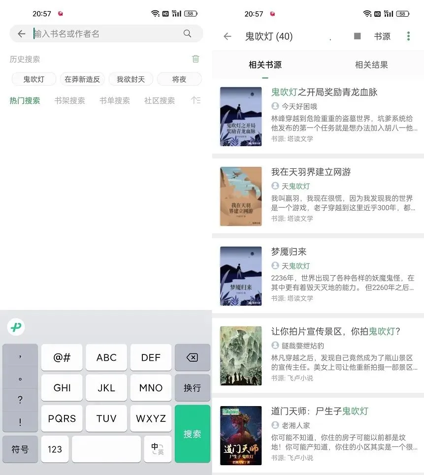 3、搜书大师简洁版顶部的搜索功能也非常强大,只要知道书名,就可以通过搜索名称找到,支持全网书源搜索,如图所示。