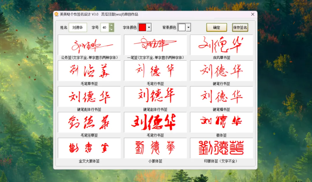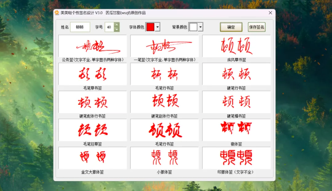 傻瓜式操作,只需要输入自己的名字,即可生成不同风格的签名:
