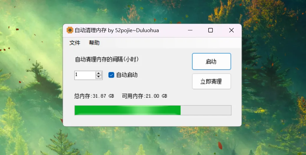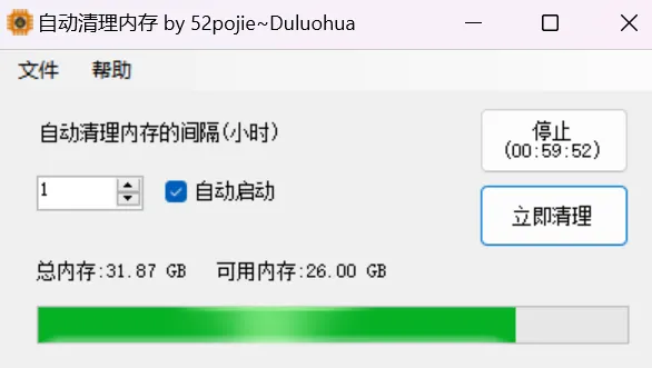 如你所见,除了一键立即清理内存外,它还支持定时清理。可以按照设定好的时间间隔,自动清理内存。