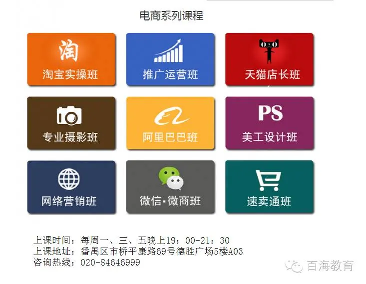 百海·俊凌电商学院培训课程有:淘宝创业班、淘宝运营班、手机淘宝班、淘宝全能综合班、淘宝就业综合班、金牌客服就业班、速卖通跨境电商班、手机微店班、微信营销班、网络营销班、网络营销就业班、网络营销视频班、阿里巴巴B2B培训班、淘宝专业美工班、美工就业班、等一系列课程。等你来选!