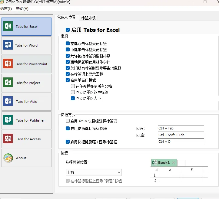 Office 多标签页插件Office Tab支持自定义标签外观、标签的显示位置、标签的关闭方式、随意拖拽标签位置等。Office Tab为Microsoft Office2010版以上和Office 365(包括Word,Excel,PowerPoint,Publisher,Access,Project和Visio)带来了标签式界面。