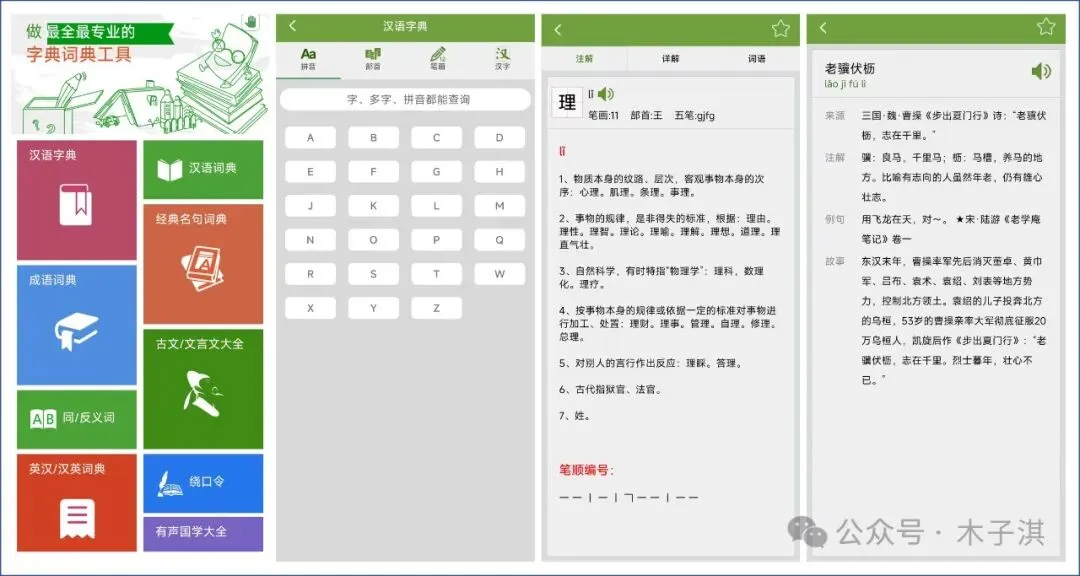 其中汉语字典支持拼音、部首、笔画、汉字查询,每个汉字会提供笔画数量、部首、五笔、发音、笔顺编号、详细解释、相关词语。