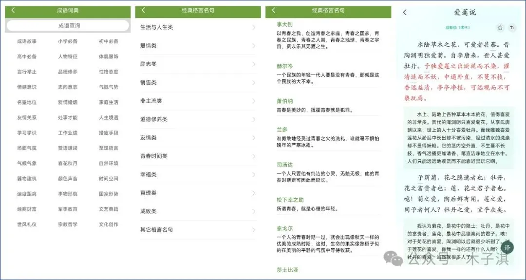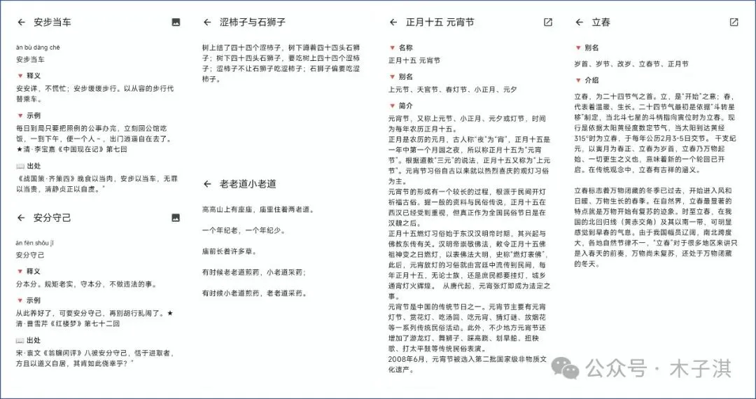 成语板块支持成语查询功能,包括释义、示例、出处;诗词名句板块支持竖排展示,知识卡片板块可以帮助你学习各种文学常识,传统色板块支持发现唯美传统色、复制颜色。