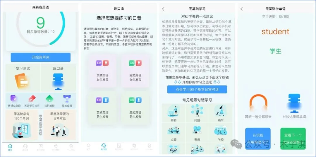 它支持输入句子或段落查看句子单词发音易错点,可以帮助你纠正发音,支持学习零基础必背 180 个单词和零基础 60 个基本日常对话。