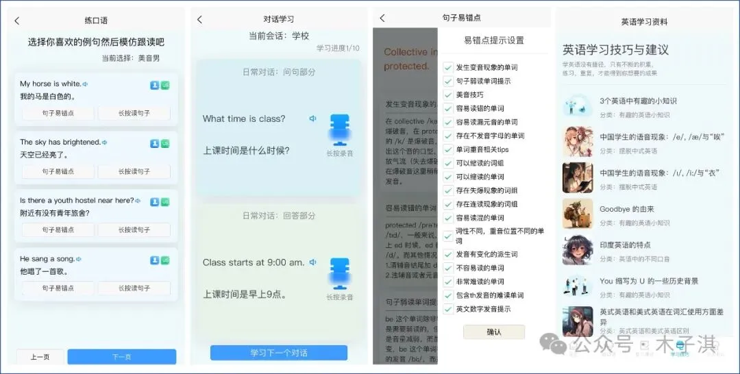 它支持练口语功能,支持选择美式英语和英式英语,支持提供句子易错点,包括:容易读混的单词、可以缩读的单词、句子弱读单词提示、发音有变化的派生词、存在不发音字母的单词、容易读错的单词、词性不同重音位置不同的单词、存在连续现象和失爆现象的词组等。
