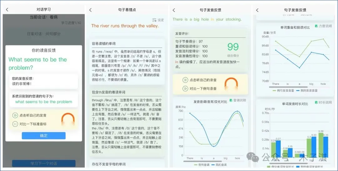 它支持长按读句子,支持发音分析和发音评分,包括:句子节奏得分、重读和弱读得分、发音流利度得分、发音准确性得分、自己的发音录音、对比例句录音、发音音调变化对比图、单词发音时长对比图、单词重音和弱读对比图。