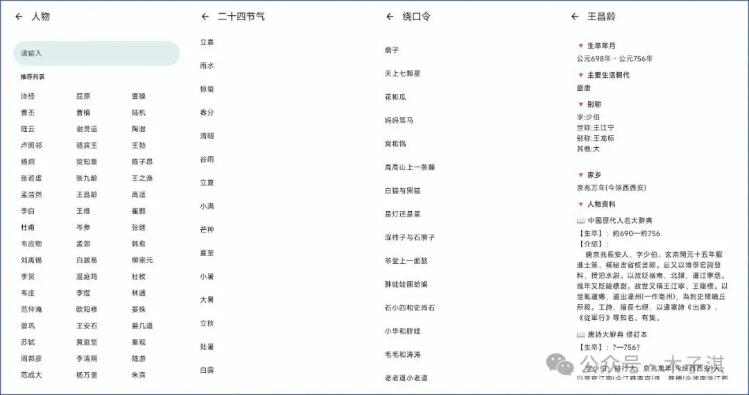 打开软件可以看到的功能板块包括:诗文、诗文名句、歇后语、成语、绕口令、传统节日、二十四节气、知识卡片、人物、传统色,第一次打开软件,点击这些功能板块是一片空白,需要点击右上角设置按钮,再点击同步数据按钮,这里可以看到详细数据。