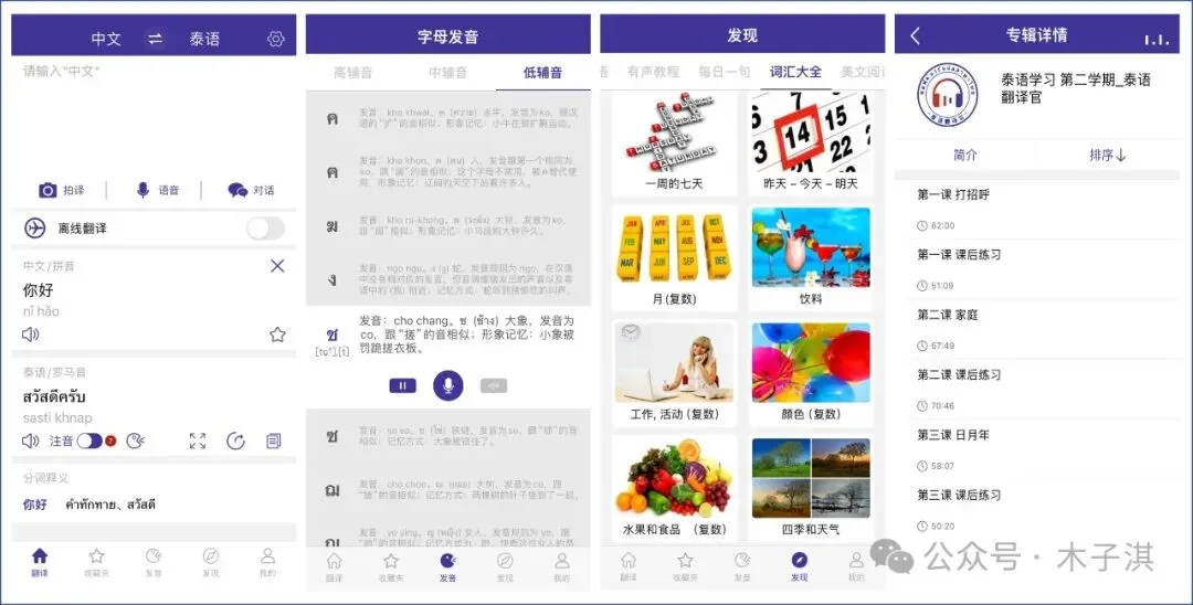 最后,它还支持的泰语学习功能包括:注音对照学习、泰文横屏展示学习、翻译收藏、字母发音跟读。