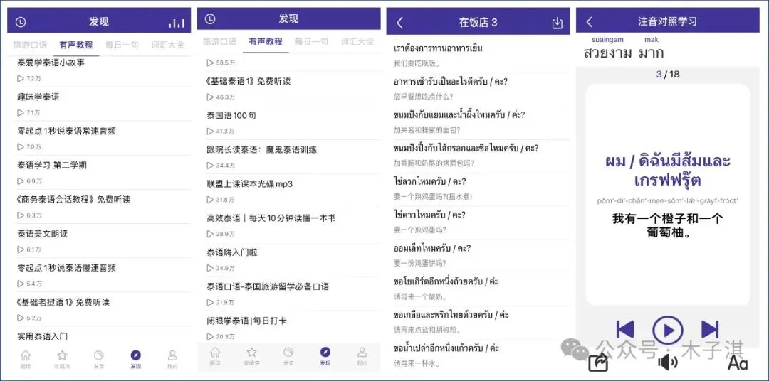 有声教程板块包括:泰语每日跟读、基础泰语、泰语日常口语对话、泰语口语教程、泰语故事、趣味学泰语、泰语美文朗读、原汁原味泰语、泰语字母发音、泰语情景口语、实用泰语、泰语入门等。