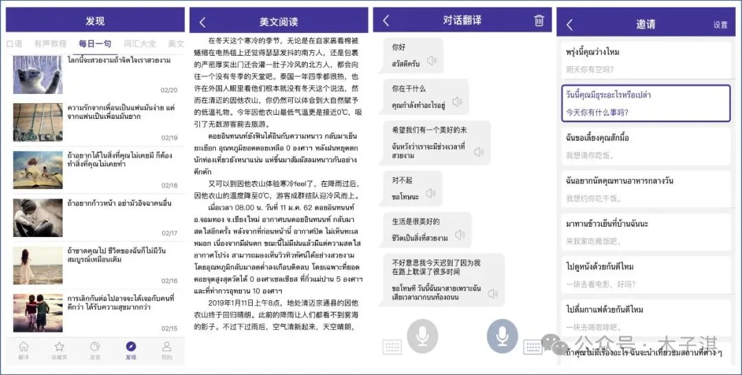 每日一句支持每天更新一句泰语句子,美文阅读支持中泰双语阅读,旅游口语支持精选最常用旅游口头语。