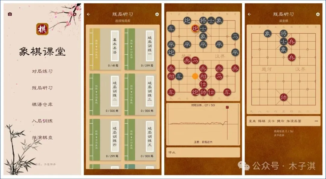 其中对局训练支持选择新局和选择开局,支持悔棋、提示、强变、着法、对局分析、推演局面、交换局面、翻转棋盘、保存棋盘、生成动图。