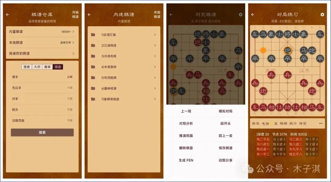 入局训练支持添加训练方案,内置简单训练和中度训练;棋谱仓库支持强大的棋谱搜索功能,也支持传输棋谱功能。