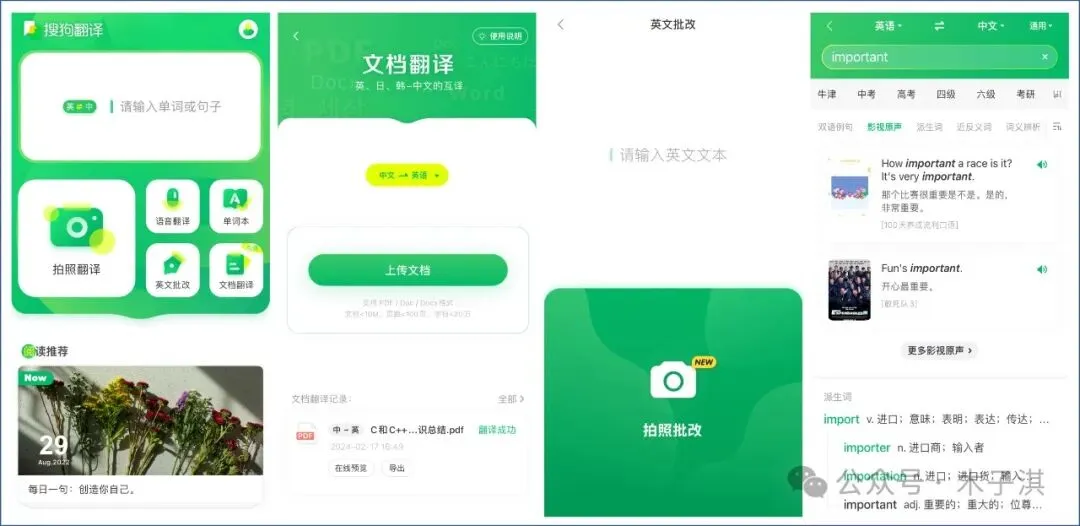 它完全免费,清新唯美,功能强大,支持的功能包括:输入翻译、文本翻译、拍照翻译、语音翻译、文档翻译、离线翻译、截屏翻译、拖拽翻译、跨软件翻译、英文批改、单词本;它的使用场景丰富,包括:英语学习、日常翻译、论文写作、文献翻译、出国旅游等。