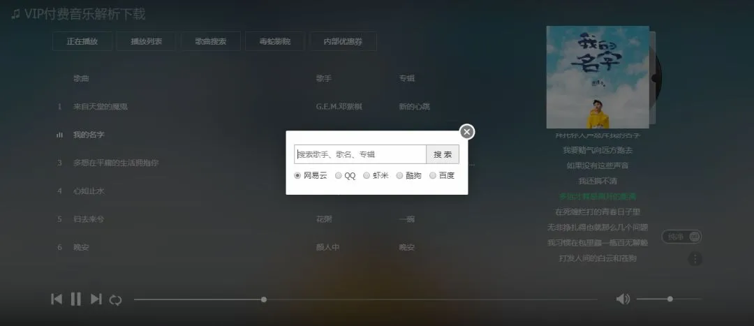 支持:网易音乐,QQ音乐,酷狗音乐、百度音乐