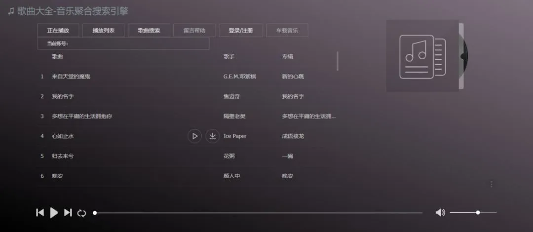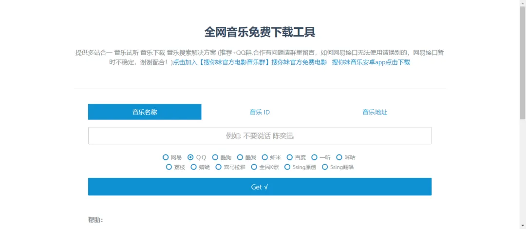 支持:网易音乐,QQ音乐,酷狗音乐,酷我音乐,虾米音乐,百度,一听,咪咕,荔枝,蜻蜓,喜马拉雅,全民K歌,5sing原创,5sing翻唱,歌曲可在线听跟下载,还提供歌词下载。