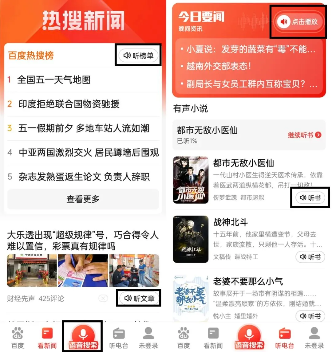 热搜榜、资讯流、今日要闻、书籍等板块,都提供了明显的语音播报按钮。
