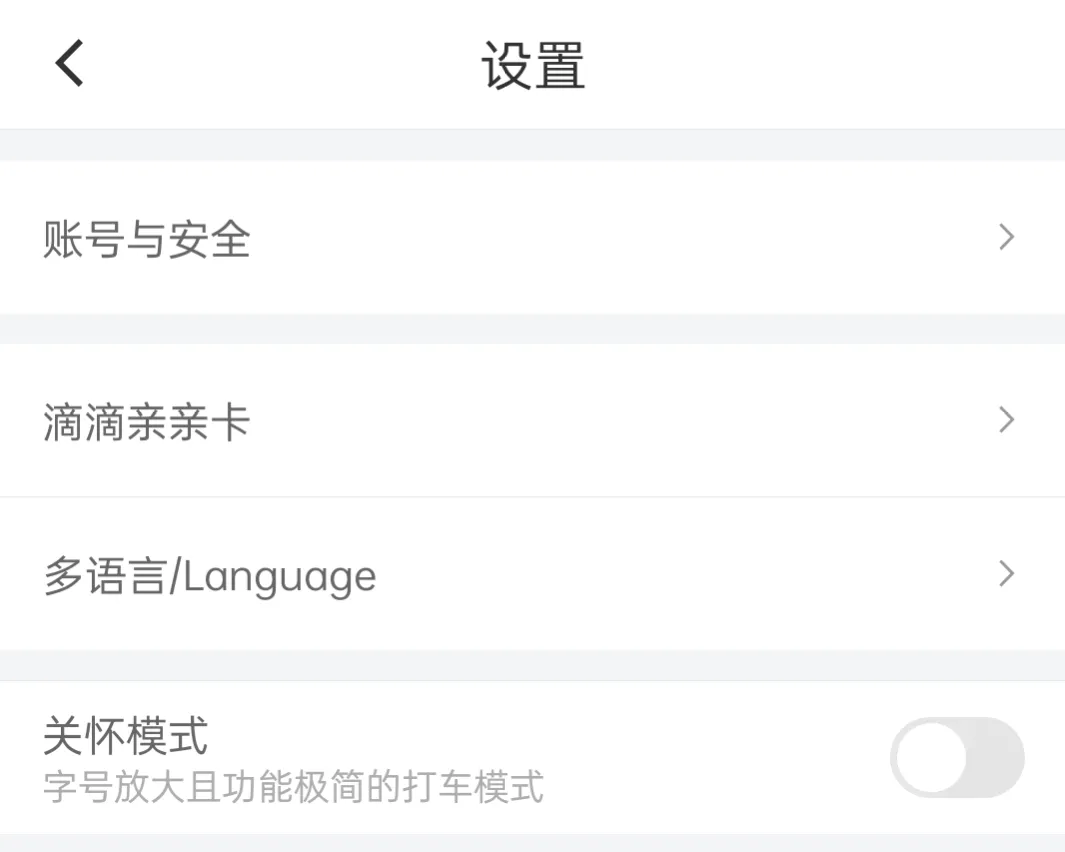 首先,滴滴的「关怀模式」优先级很高,就在设置页面的第四行。