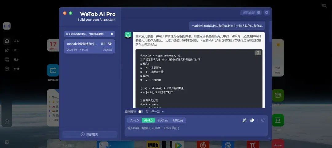 WeTab AI小组件的对话功能由原生GPT 3.5和GPT 4.0提供支持,支持联网,即开即用。