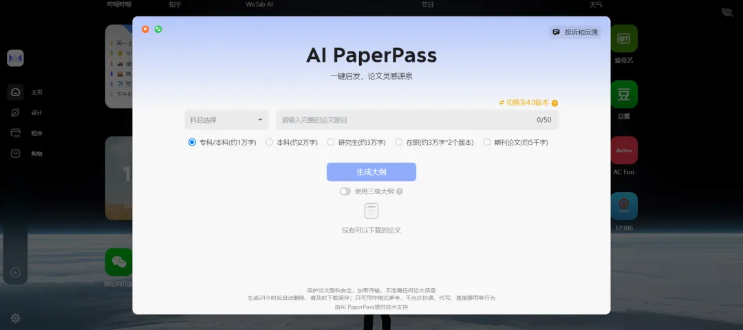 眼看着DDL了,不妨试试一键生成论文。打开WeTab的AI PaperPass组件,在线输入关键词,就能智能生成详细的大纲。