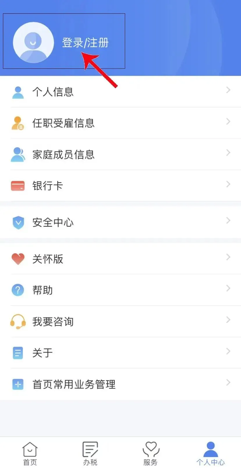 第六步 注册完成后,点击左上方的【登录/注册】,输入账号及密码(也可以设置指纹登录)登录,然后点击右下方【个人中心】。