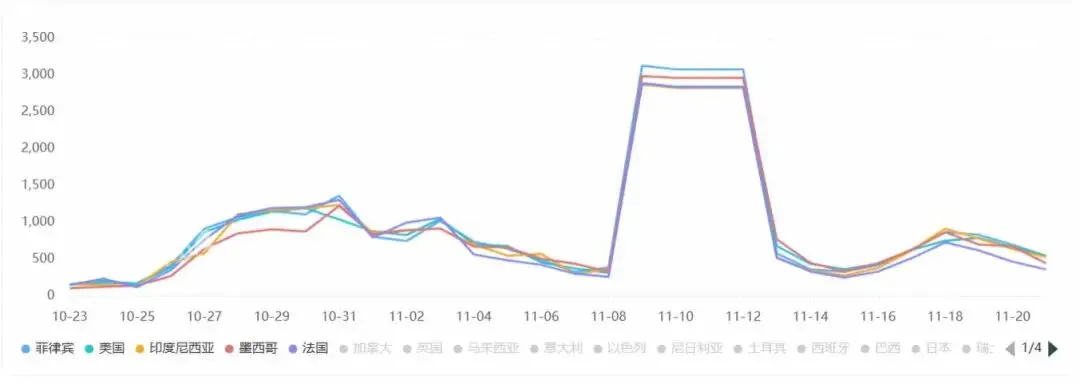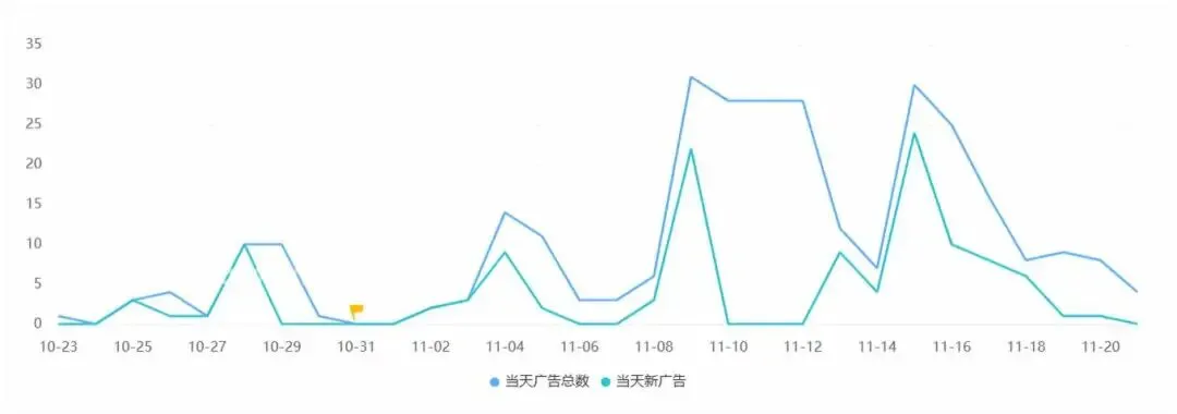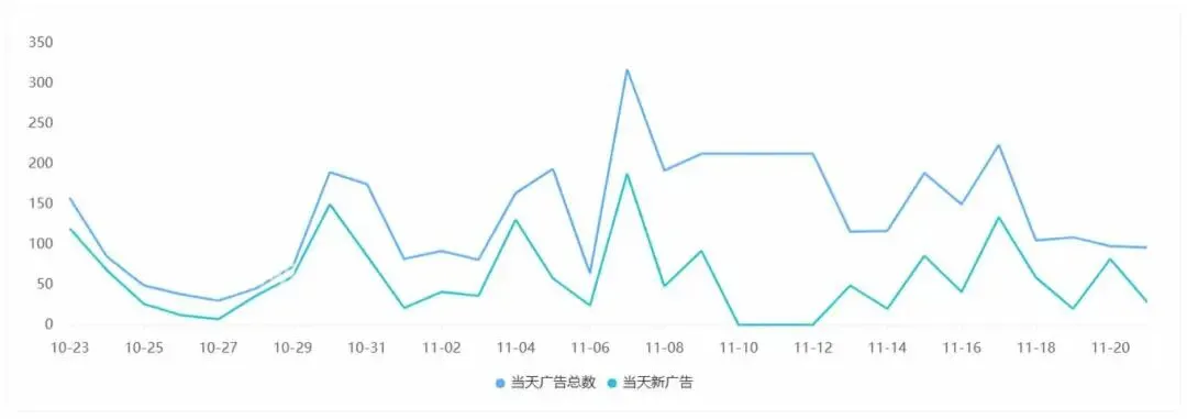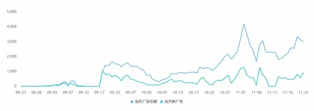 畅读信息的《MoboReels》于今年 7 月份上线海外,从 10 月下旬开始加大买量投放力度,双端日均投放量基本维持在 1000 组以上,进入 11 月后更是一度飙升至 5000 组。
