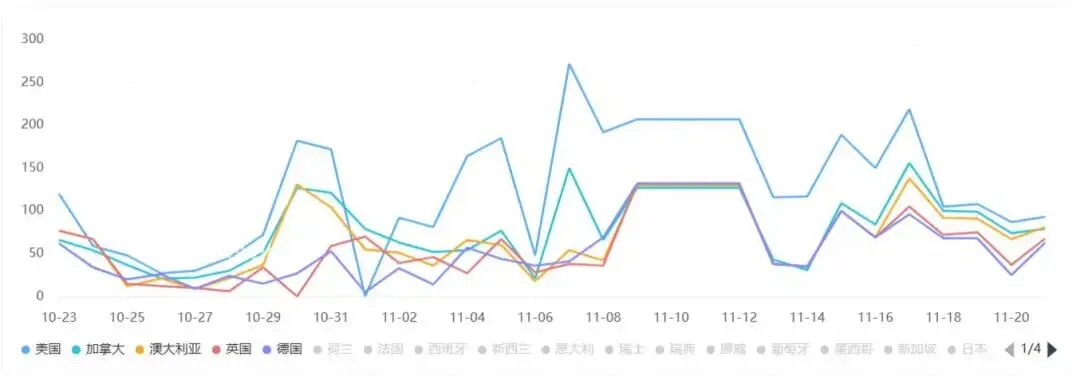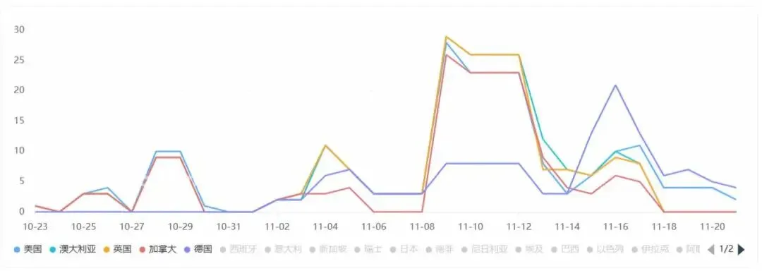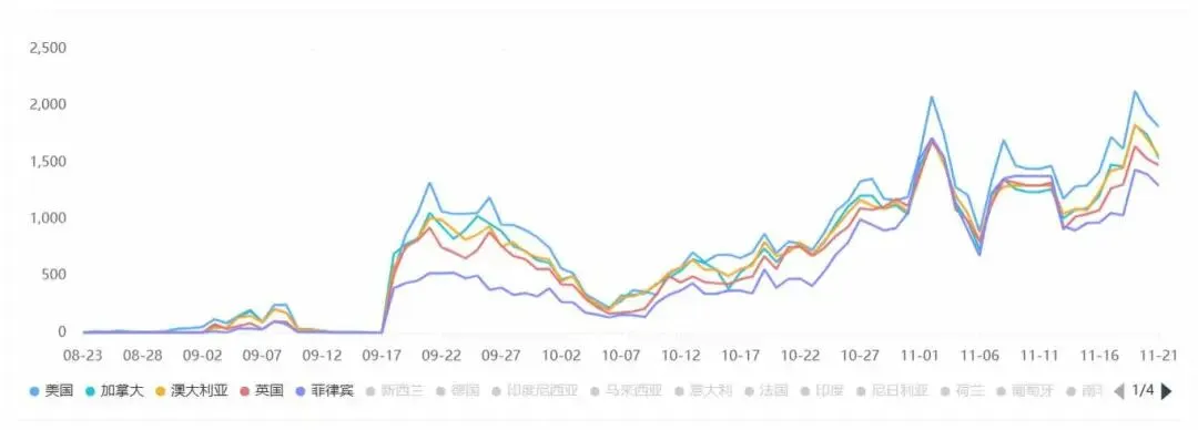 投放地区分布上,《GoodShort》TOP5投放地区为美国、加拿大、澳大利亚、英国和德国,其中从 10 月末开始,对美国市场的广告投放量明显增多。