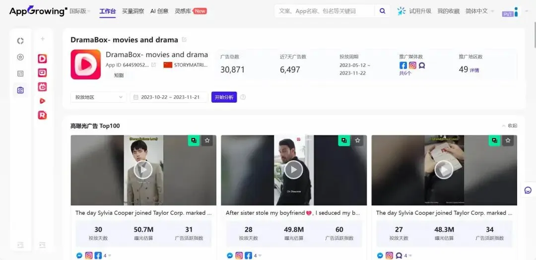根据 AppGrowing 国际版 的“App创意策略看板”功能,我们筛选出近 30 天 iOS 端《DramaBox》的高曝光广告 TOP100 和被使用最多的素材 TOP100。
