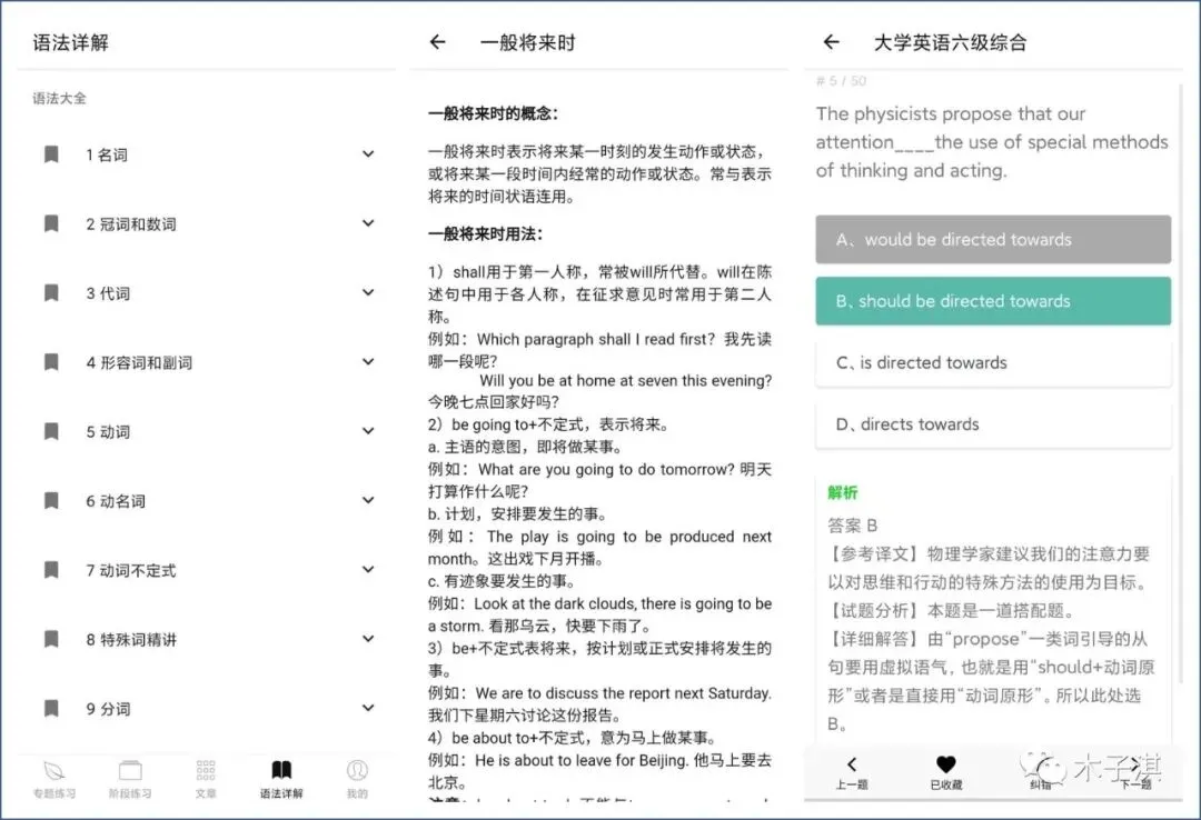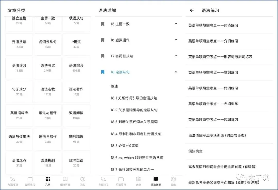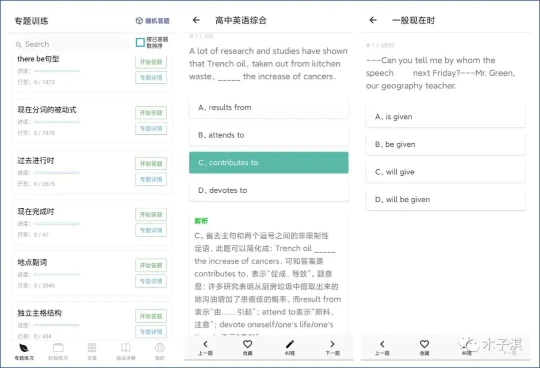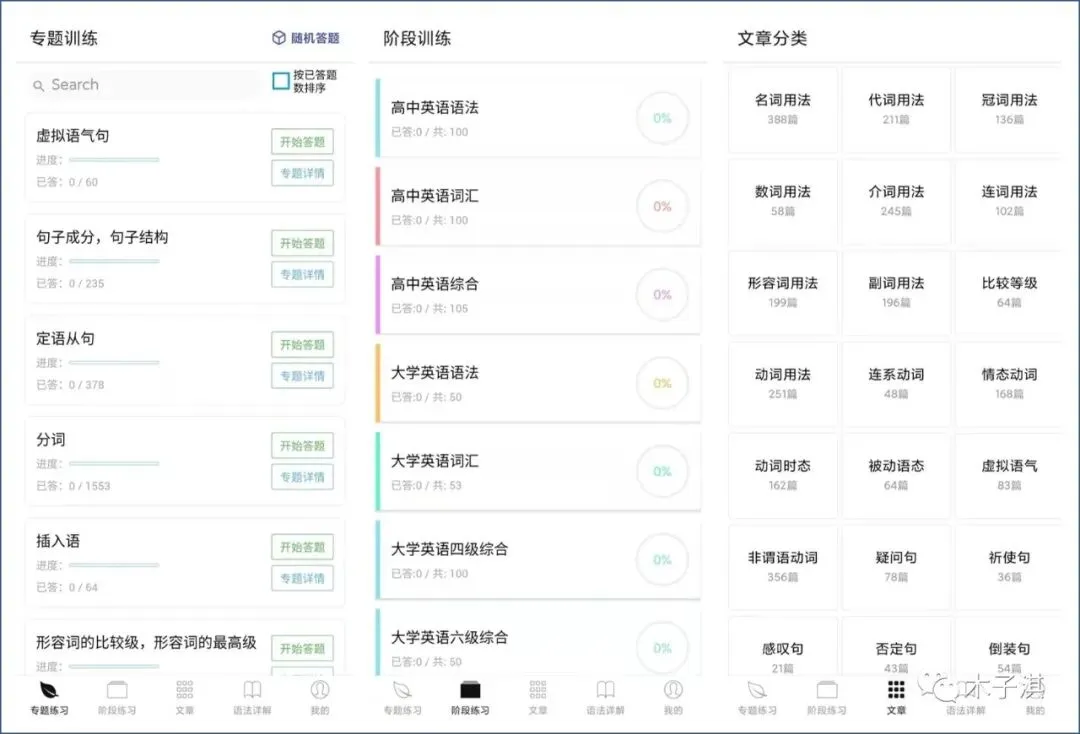 它主要支持 4 个功能版块,包括:专题练习、阶段练习、文章、语法详解,还有我的收藏、已答题、错题集。