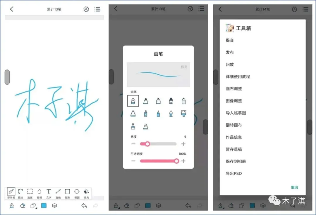 它的绘画功能还支持瞄点、选区、模糊、文字、直线、矩形、椭圆、填充、图层、画布调整、图像调整、导入临摹图、翻转画布、保存到相册、导出 PSD 。