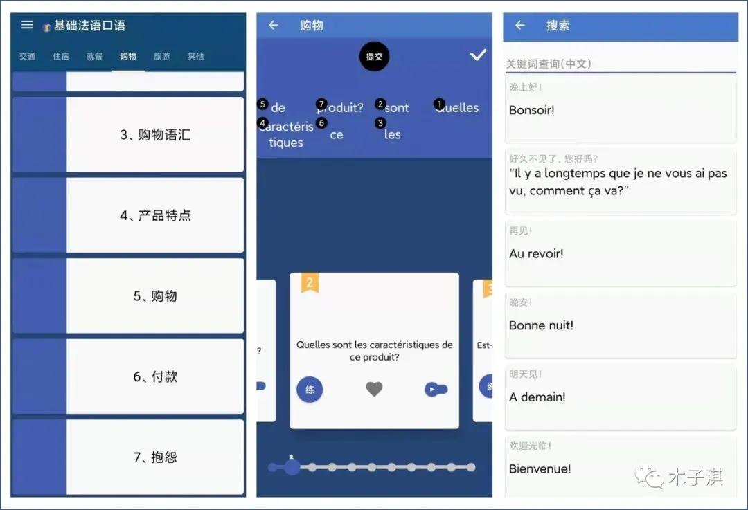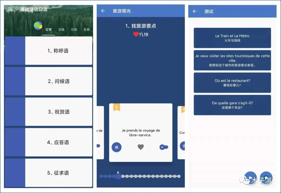它主要的特点是简单实用,比较轻量级,包含了常见的基础法语口语和短语,并且覆盖了生活的很多方面,总共有 1000 多个语句。