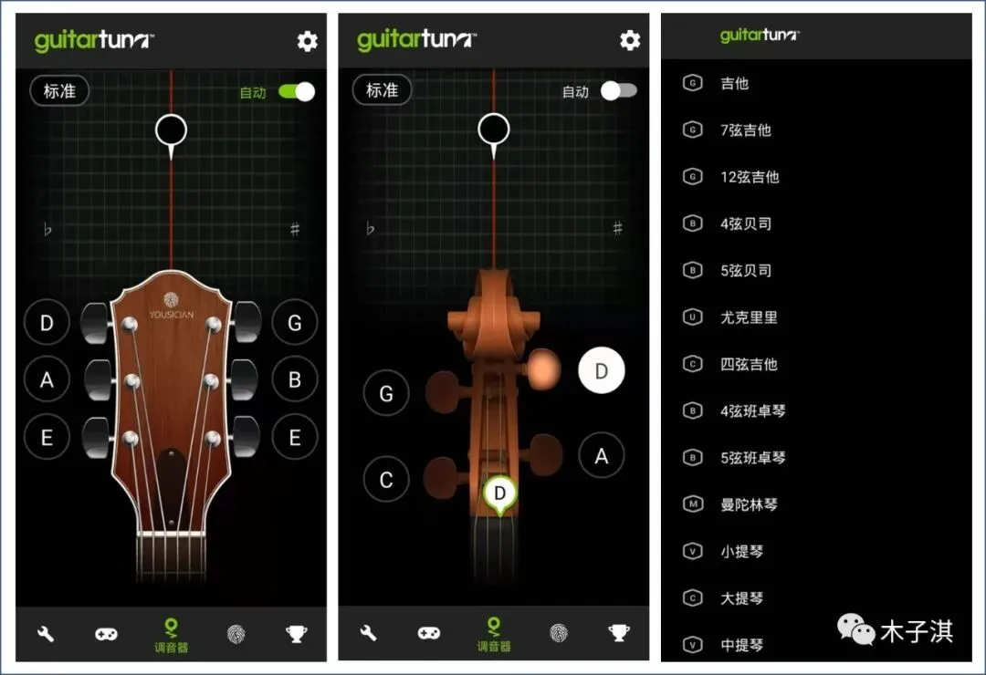 首先,它不仅适用于吉他尤克里里调音,还支持贝斯、曼陀林琴、小提琴、大提琴、中提琴等许多其它弦乐器调音,并且吉他调音也会分为 4 弦吉他、7 弦吉他、12 弦吉他等,吉他琴头可以选择原声吉他和电吉他。