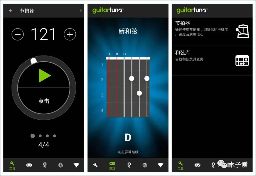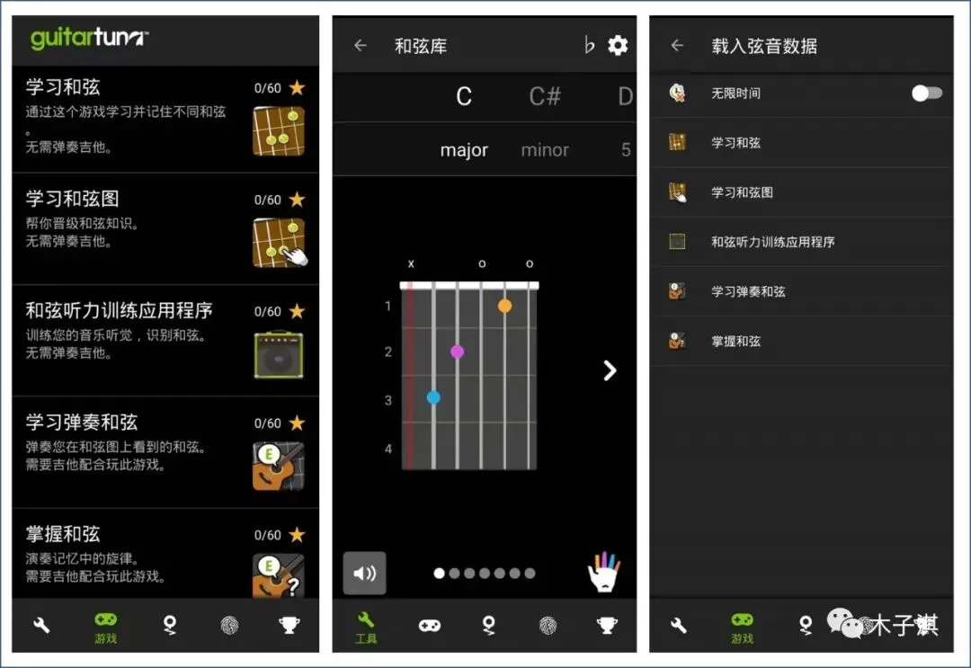 除了调音功能,它还支持学习版块,你可以学习和弦,学习和弦图、和弦听力训练、学习弹奏和弦、掌握和弦、自定义和弦游戏。