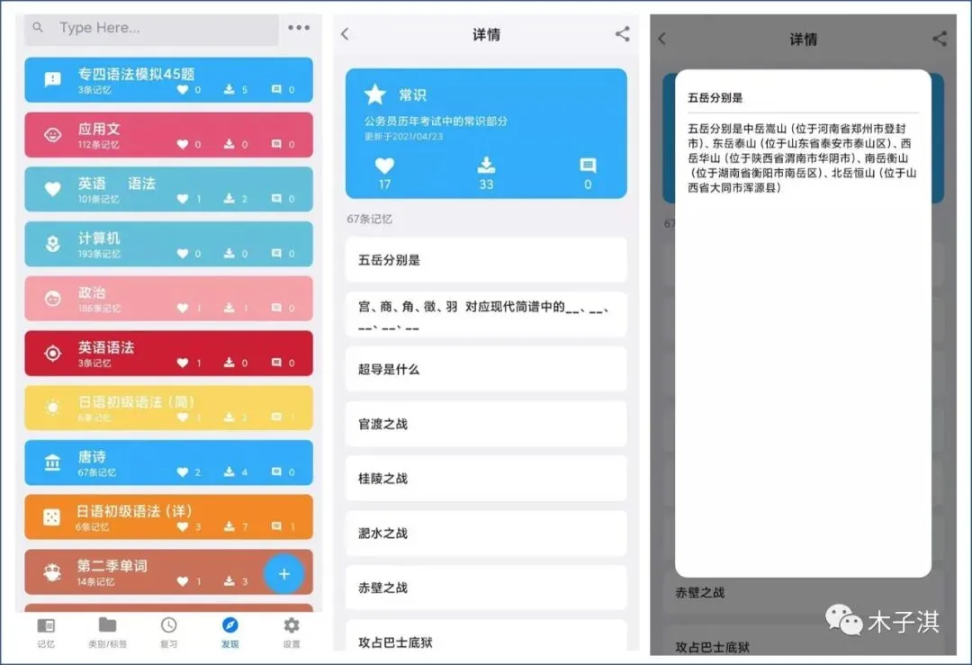 它的发现版块提供了很多记忆学习内容,例如英语语法、计算机、日语初级语法、考研英语词汇、有机化学、数学讲义、行测、线代、古诗词名句、地理常识、艺术常识、俄语课后单词、韩语学习、药剂学名词解释、教资等等。