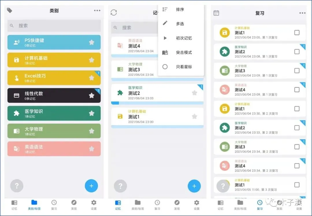 它支持类别和标签功能,将记忆内容分类管理,记忆内容支持添加文字和图片,你也可以快速检索到某条记忆内容,还支持突击模式。