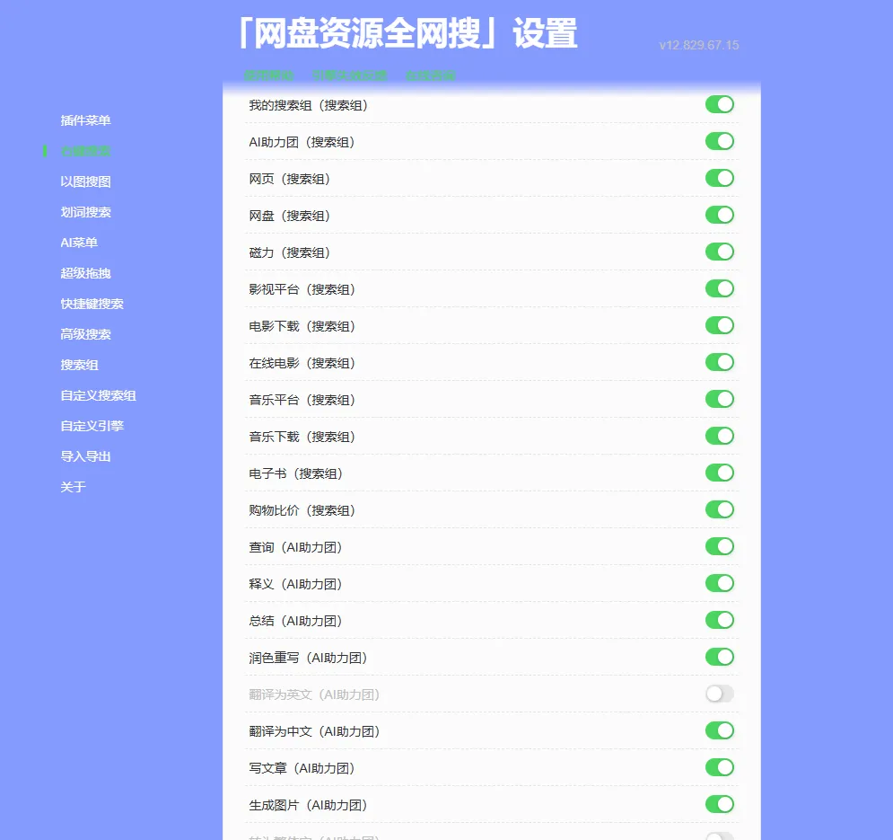 当然,也可以根据自己的习惯设置搜索,里面有各种各样的搜索,影视,音乐,电子书,网盘,以图搜图等等,还有各种ai的,应有尽有。