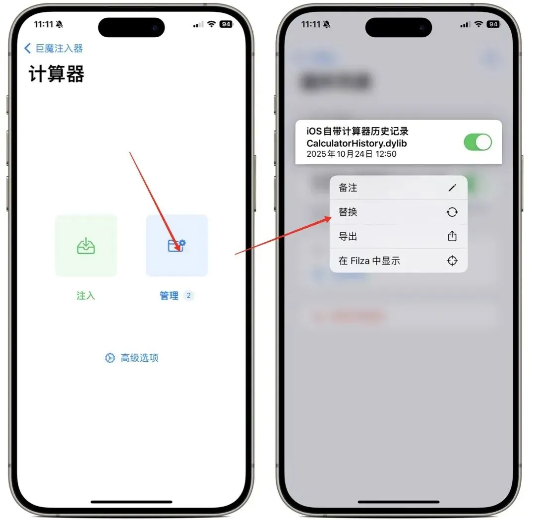 点击“管理”就会显示“计算器”里所有插件,想换哪个找到该插件“dylib”长按,弹出菜单:点击“替换”从自带“文件”App选择新插件deb/dylib即可快速更新插件。