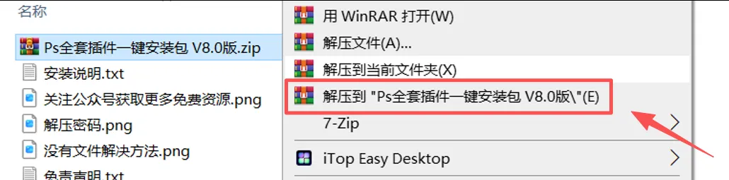 1,打开下载好的文件夹,找到压缩包【Ps全套插件一键安装包 V8.0版.zip】,鼠标右键选择【解压到【Ps全套插件一键安装包 V8.0版\】。