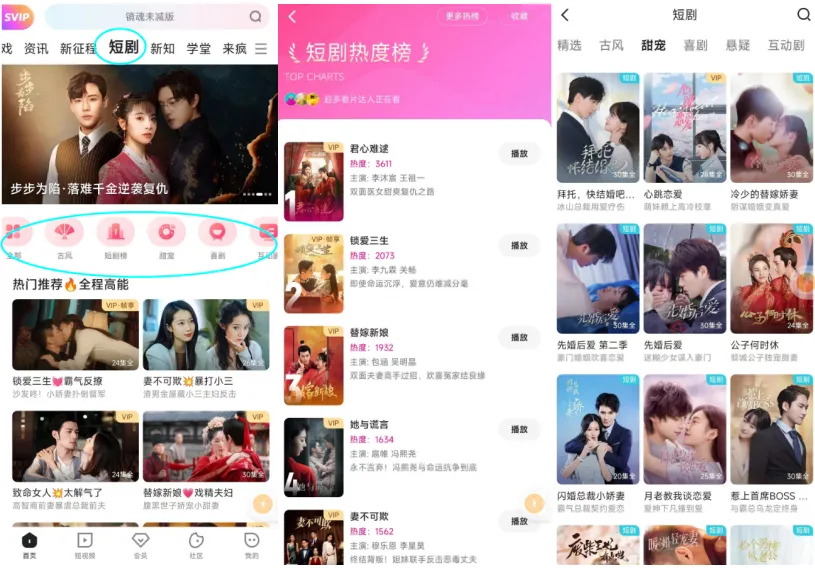 设有全部微短剧、十分剧场、短剧排行榜、即将上映等入口,以及热播短剧推荐。不少剧全集需要VIP,单集可以试看1分钟。内容偶像爱情最多100+,另有古装、都市生活、喜剧、悬疑烧脑几类。画质最低270P,免费最高可享受720P,会员可享受1080P以及臻彩视听(4K),另有智能画质功能。倍速有0.5、0.75、1、1.25、1.5、2、3倍7档。