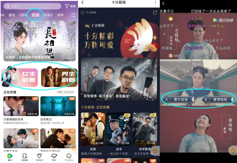 一级导航栏有“短剧”,但排序较为靠后,需要多滑一会;电视剧栏目下有短剧栏目入口;另外,APP底部短视频入口进去有“小剧场”。横屏竖屏剧都有,也有互动剧的单独分类。互动剧及竖屏短剧体验,在手机端体验良好。