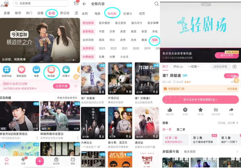 哔哩哔哩的微短剧在导航栏里隐藏的最深,要经过四层:一级导航栏影视-二级导航栏电视剧-三级导航栏找电视剧-全部风格(短剧),其实B站也是做了自己的“轻剧场”,不过不体现在网页上,而是在片头或尾,内容以玄幻类为主。共有内容20余部,其中免费的有一半。
