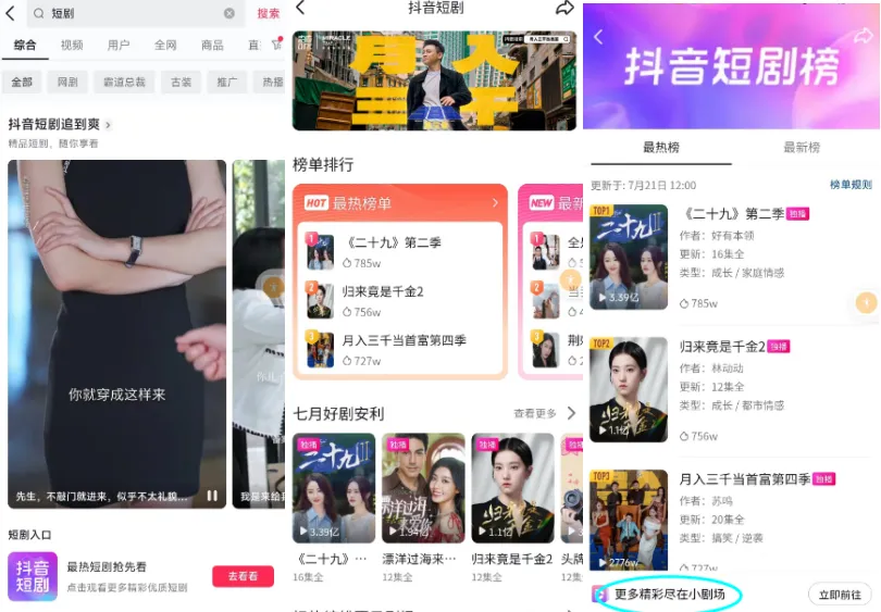 搜索短剧或者微短剧,有短剧内容推荐以及“抖音短剧”入口,抖音短剧榜涵盖最新、最热两个类别,还会按时间维度推剧。