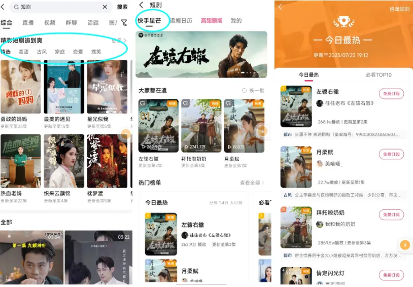 搜索短剧,首屏为“精彩短剧追到爽”专题,并细分为高甜、古风、家庭、恋爱、搞笑几类,继续点击进入快手的短剧频道,分“快手星芒”、追剧日历、高甜剧场、热门榜单等栏目。