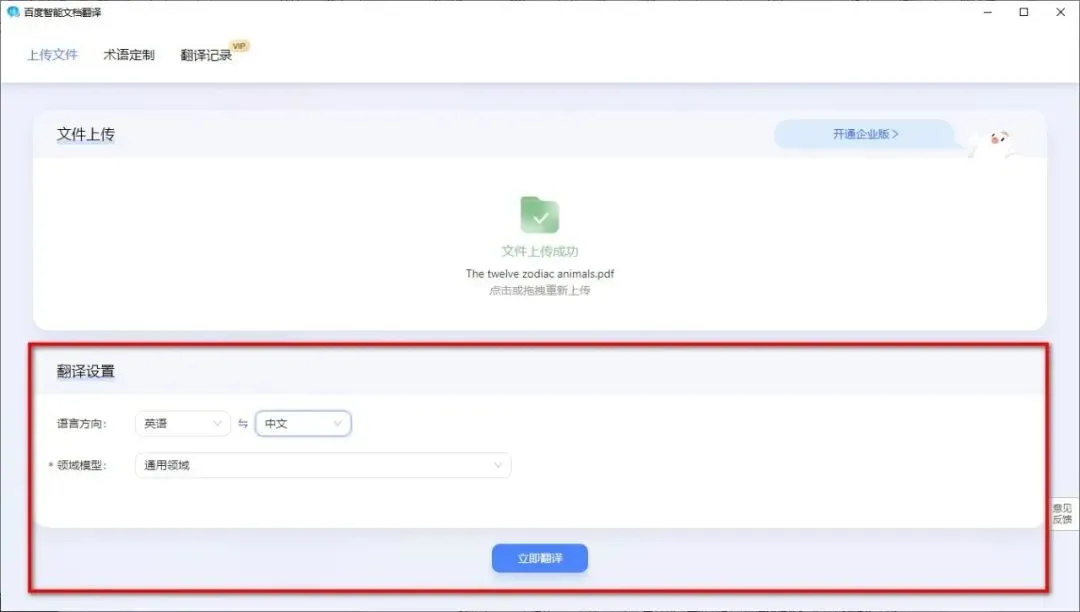 在弹出的窗口中,设置翻译语言和需要翻译的页码,点击“立即翻译”很快就能得到翻译结果。