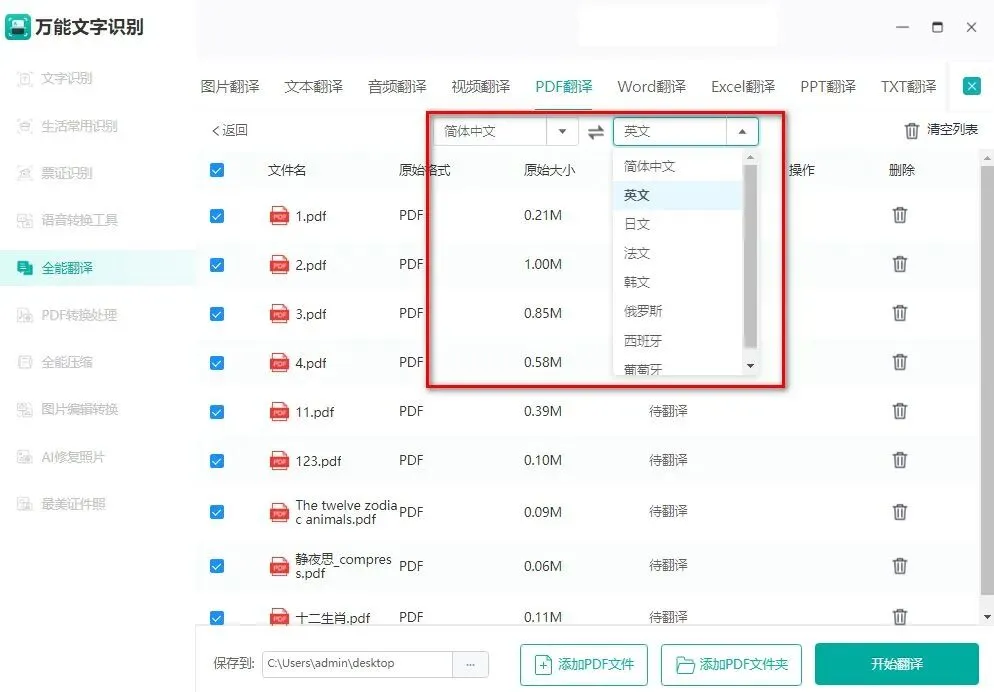 一个OCR软件,它的翻译工具支持翻译PDF、Word、Excel、TXT、PPT等多种格式的文档,能翻译中文、英文、日语等多国语言,一次可添加多个文档进行批量翻译,非常便捷好用。