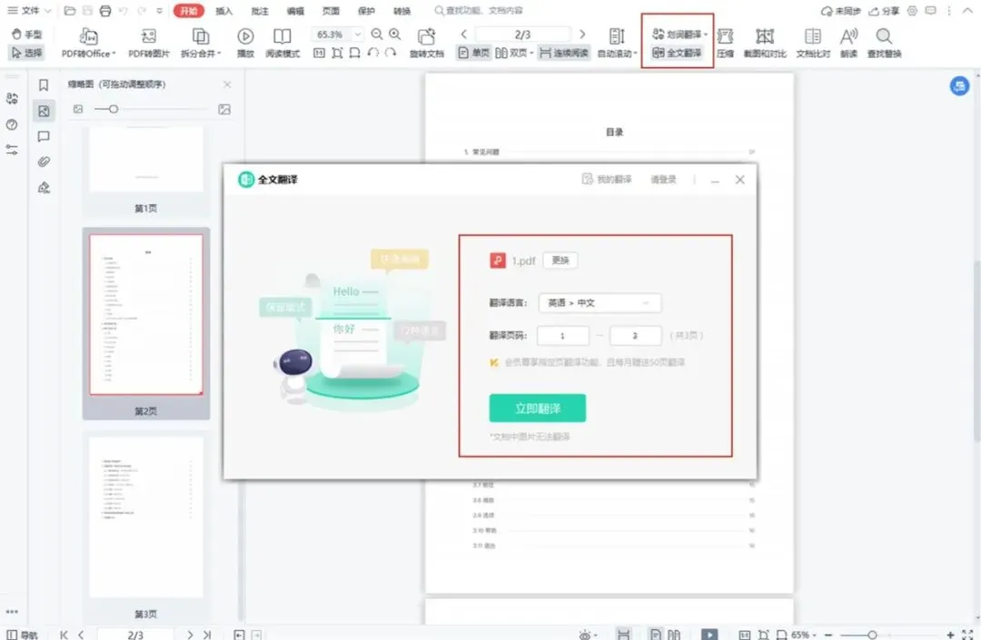 但如果没有开通WPS会员的话,每次就只能翻译3页文档,而且还需要是连续的。