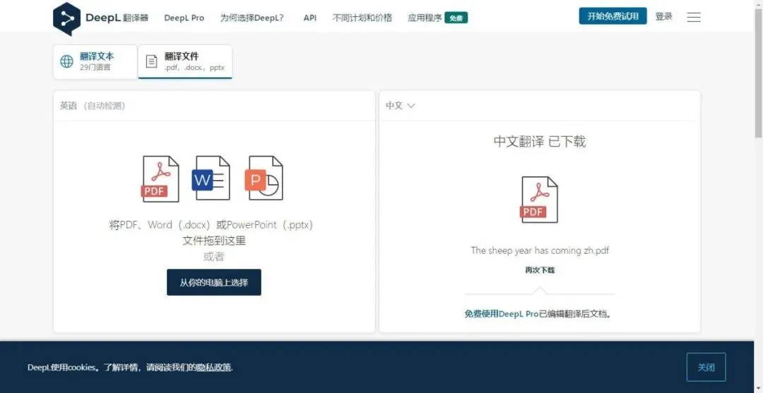 一个很好用的在线翻译网站,支持翻译中文、英语、日语、德语等多种语言,提供文本翻译以及文档翻译功能,可上传pdf、docx、ppt格式的文档进行翻译。
