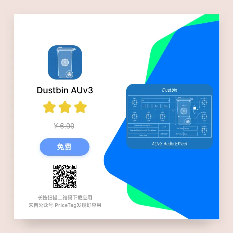 「Dustbin」是一款有趣的“垃圾桶混音器”。App 的作者与朋友找到了一个真正的垃圾桶,并为其安装扬声器进行了测试,随后将其令人振奋的声学表现在「Dustbin」App 中进行了忠实还原。试试看,打开「Dustbin」,用垃圾桶来创作真正的音乐!「Dustbin」支持独立运行,也可作为插件在支持 AUv3 的 App(如 GarageBand)中以效果器存在。