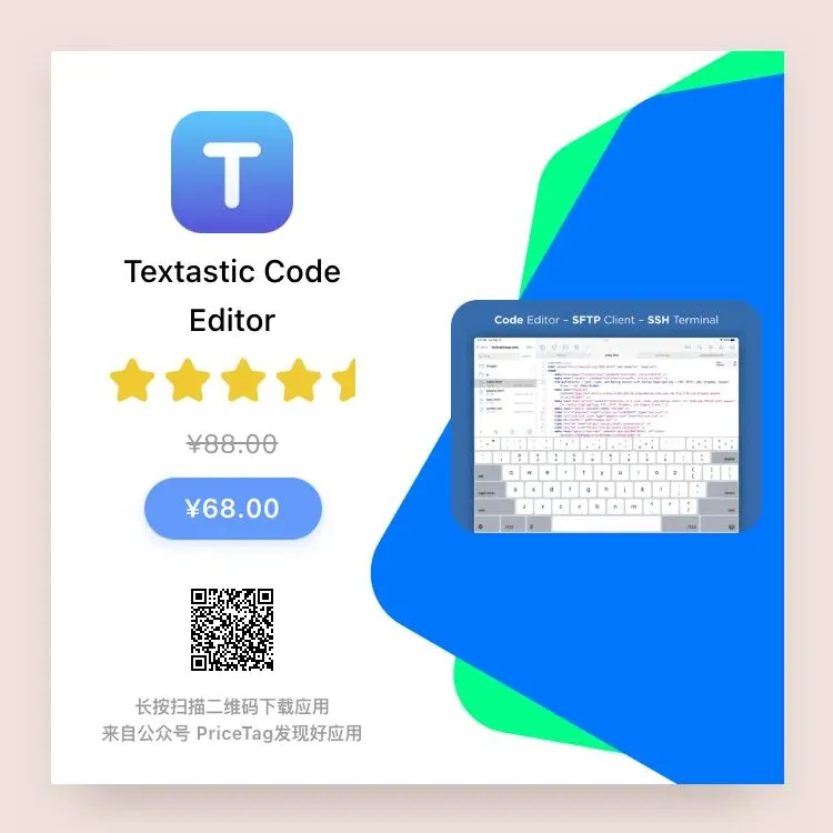 「Textastic」是一款 iOS 平台的代码编辑工具,App 功能全面且用途众多,不仅支持多种编程语言的代码着色,还能通过 SFTP、WebDAV、FTP 等协议,直接编辑远端设备上的文件。除此以外,「Textastic」还提供了 Markdown & HTML 文件预览、iPad 多窗口等功能。