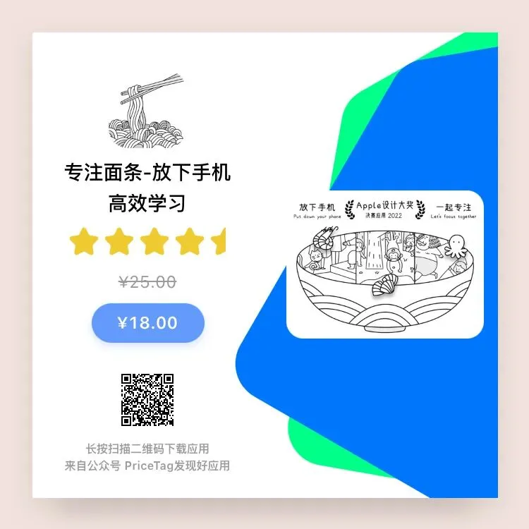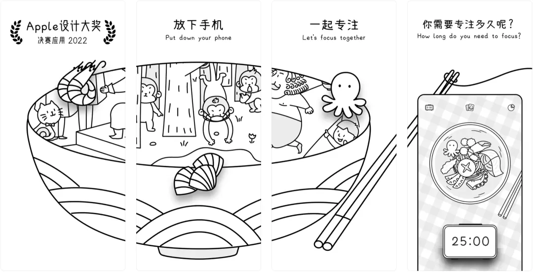 「专注面条」是一款能帮助你提高专注力的应用,打开「专注面条」并将手机屏幕朝下,计时器会开始工作,在完成设定好的专注时间后再拿起手机,一碗凝结着你专注力的「专注好面」即刻出锅。
