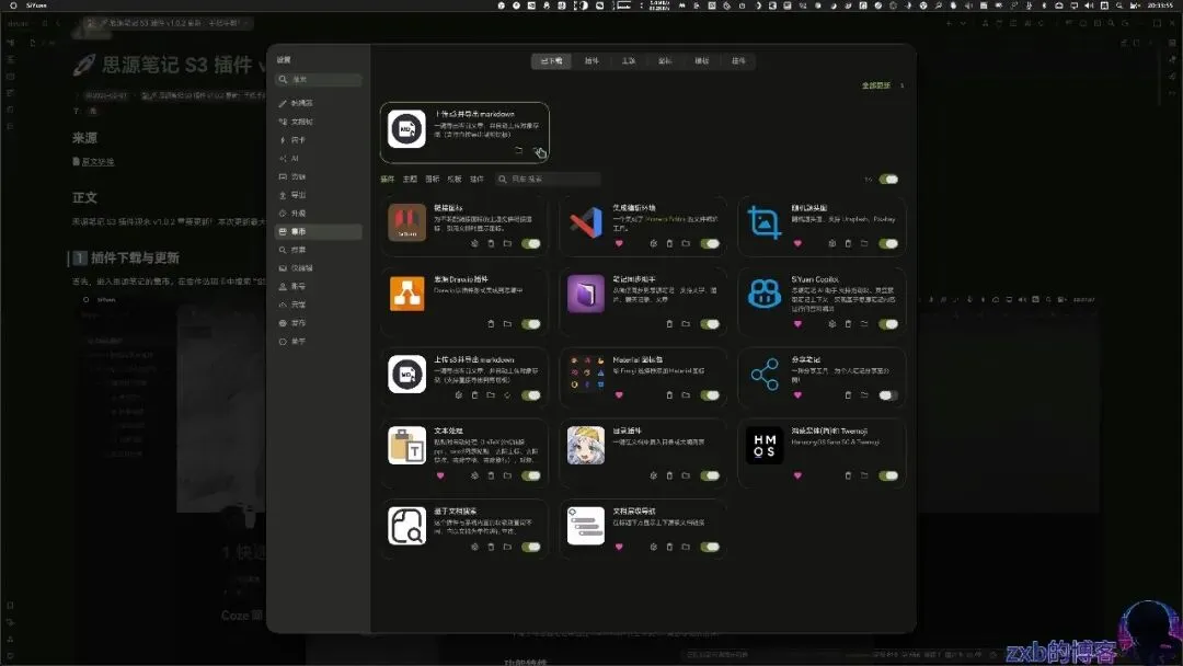 首先,进入思源笔记的集市。在插件选项卡中找到“上传 S3 并导出 Markdown”,确保版本已更新至 v1.0.3。
